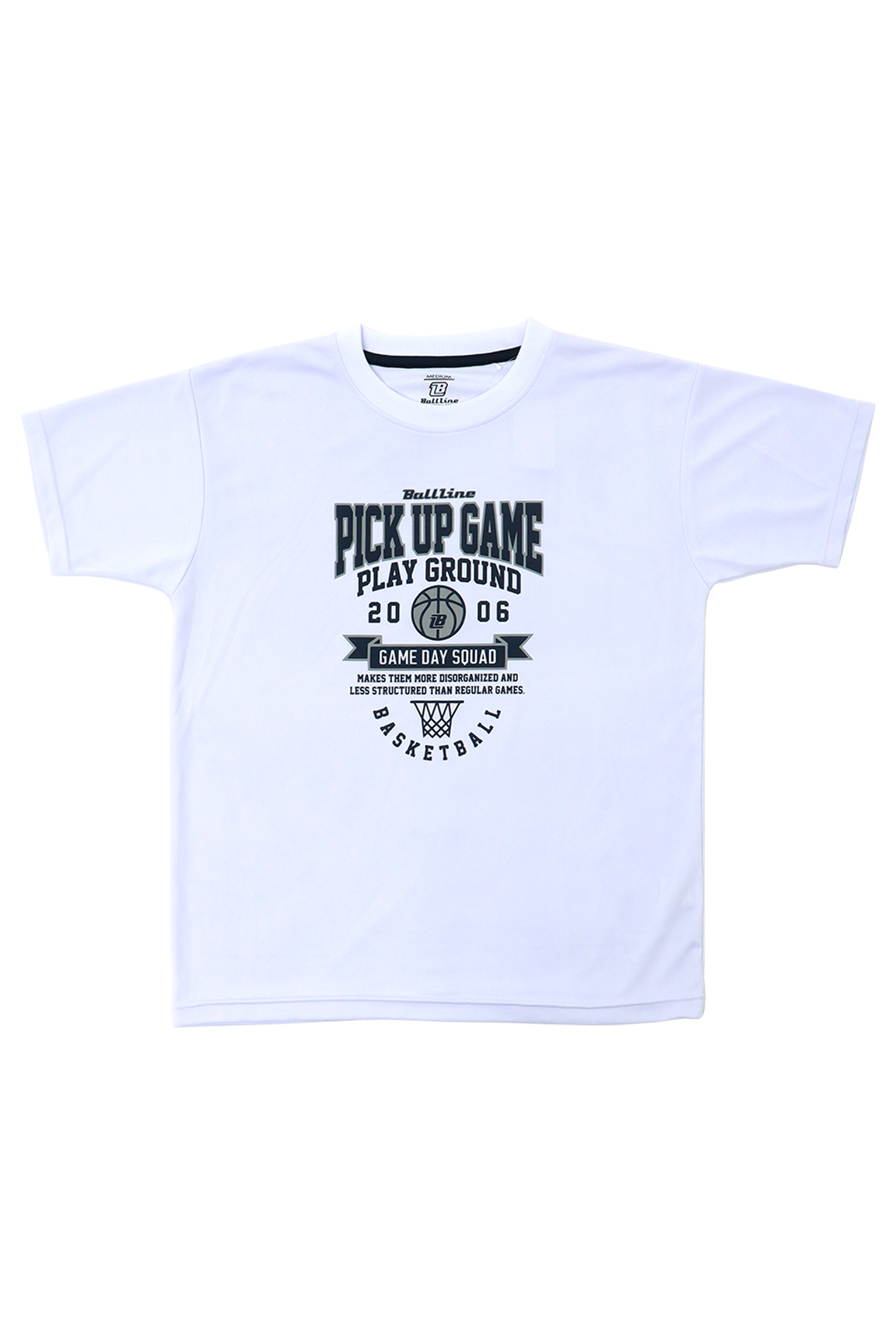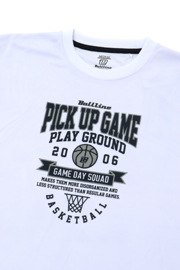 BALL LINEの『スリムフィット』なTシャツ。※「品番 BT-」シリーズとはサイズ感が異なりますのでご注意くださいませ。PICK UP GAMEの文字とリングのイラストがバスケットボールらしいデザイン。■プリントカラーホワイト…NYブルー、グレーブラック…ケリー、ホワイトネイビー…ホワイト、グレーグリーン…ホワイト、カーキ■サイズレンジS・M・L・XL■素材[シュクール(polyester100%)]吸水・速乾性の高い素材で練習着にぴったり■シーズン2026 Spring&Summer